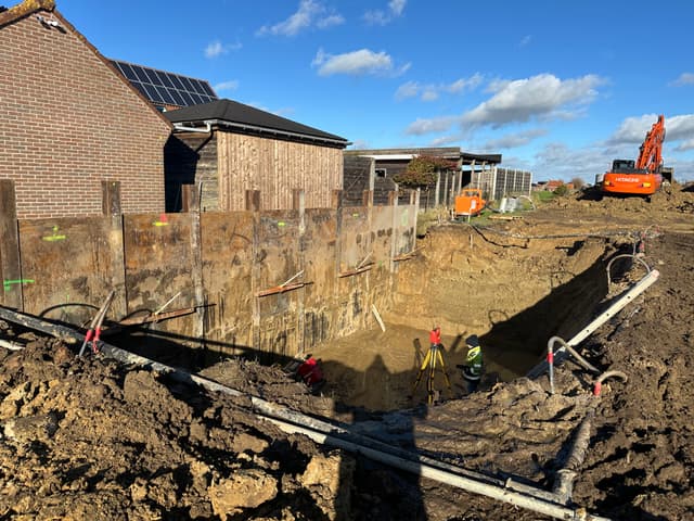 Fase 2 Een damwand zorgt voor een veilige bouwput en beschermt de aanpalende gebouwen.