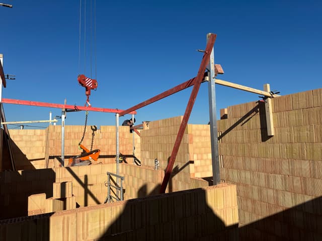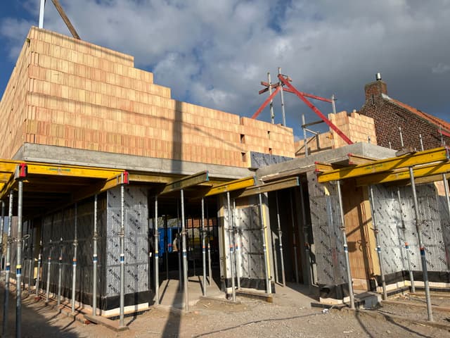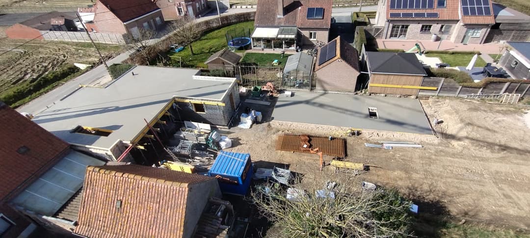 De betonplaat op het gelijkvloers is intussen gegoten en gedrogen. Nu is het tijd om de muren te beginnen metsen op het verdiep. Het verandert iedere dag!