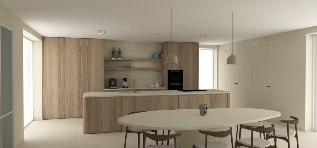 Zoals je kunt zien op de foto, hebben we van de interieurarchitect twee verschillende ontwerpen gehad voor de keuken. De ene in frozen wallnut, de andere in het wit.